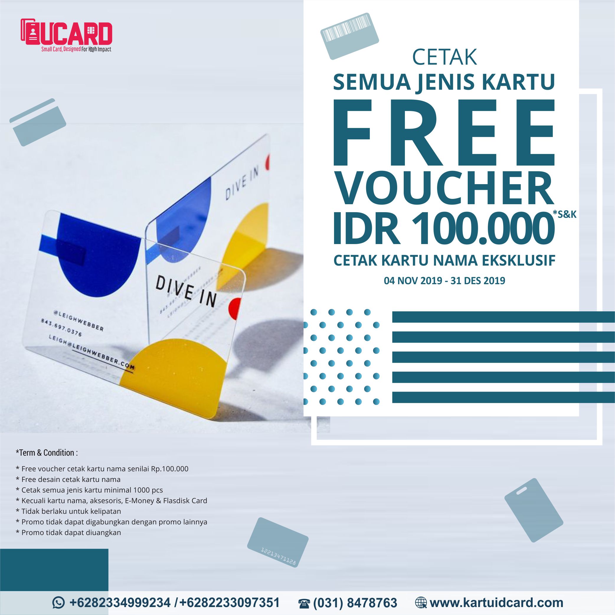 UCard bagi- bagi voucher cetak kartu nama eksklusif IDR 100.000 untuk Anda. Cukup dengan memesan kartu jenis apapun. Jangan lewatkan kesempatan ini.